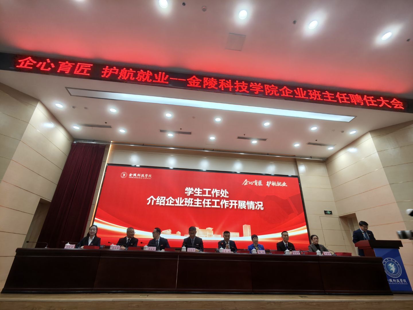 聘任仪式上,金陵科技学院介绍了企业班主任工作召开情况。该项工作以《关于加快构建高校思想政治工作体系的意见》《深入推进江苏省新时代高校辅导员队伍建设行动计划》《关于深化产教融合的若干意见》等文件为背景,已先后在动物科学与食品工程学院、园艺园林学院、软件工程学院、艺术学院、动漫学院、外国语学院中试点实施近十年,旨在聘任政治素质过硬、实践经验丰富、育人意愿强烈的优秀企业家、行业领军人才、技术骨干担任企业班主任,共同探索“企业-学校-学生”三位一体的育人模式,进一步强化人才培养和产业需求的相互融通,促进“培养—实践—就业”全过程教育链的贯通。
